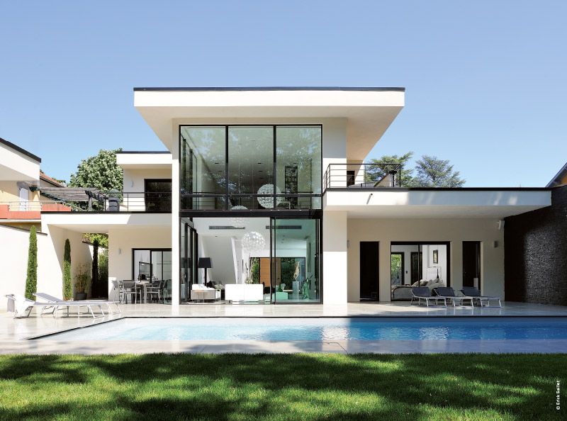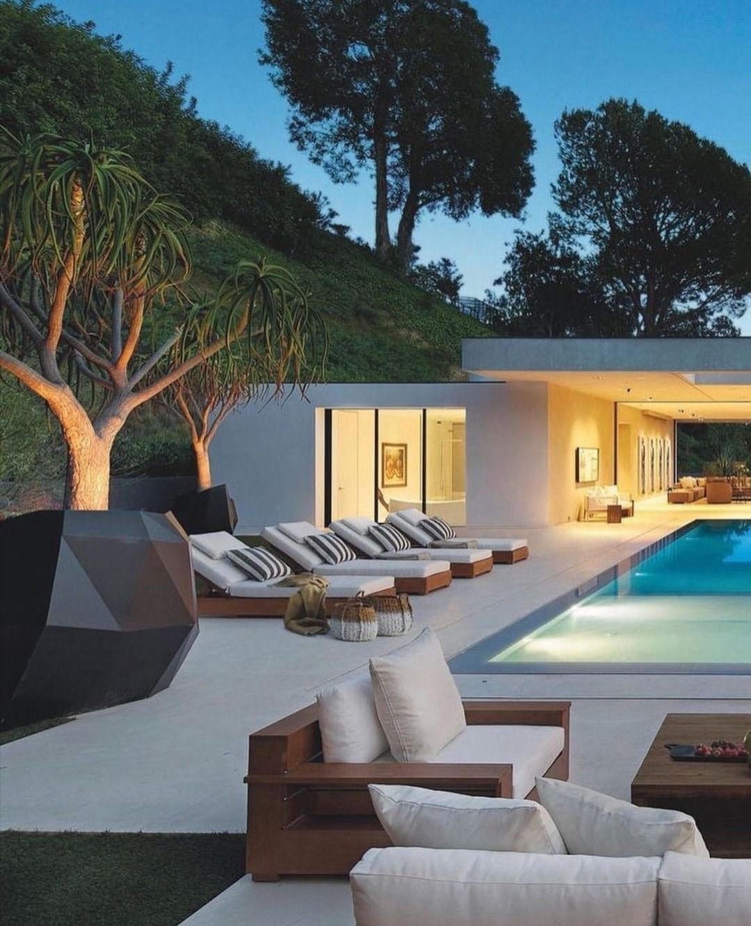 Ses lignes sont simples pour s’accorder avec le style épuré de la maison. Pour plus d'élégance, il est possible d’opter pour un bassin miroir ou à débordement. Sur la terrasse, vous pouvez installer du mobilier confortable tel que des canapés et fauteuils d’extérieur, des transats mais aussi des tapis et des luminaires bohèmes de type lanternes. En plus, il est aussi possible d'installer un abri qui reprend le style architectural de la maison et qui pourra ainsi accueillir une cuisine d’été ou un espace spa.