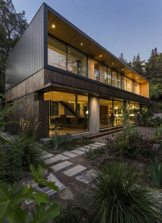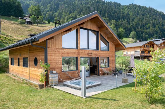 Dans l’imaginaire collectif, la maison ossature bois n’est ni plus ni moins qu’un chalet de montagne. Mais il est tout à fait possible de lui donner un aspect très moderne. C’est ce que démontre cette maison en bois qui reprend les codes du chalet avec sa grande toiture à 2 pans. Elle intègre toutefois des éléments modernes comme des ouvertures XXL en alu.