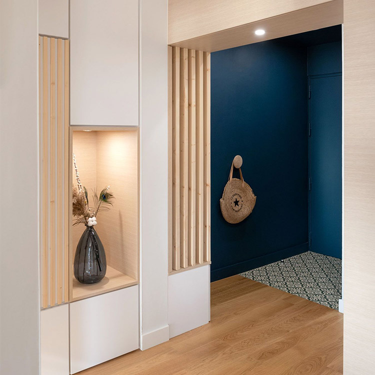 Ces installations laissent passer la lumière mais permettent d’apporter plus d'intimité à l’entrée. Pour délimiter les espaces tout en apportant de la fonctionnalité à l’entrée, vous pouvez aussi installer un meuble de rangement. Côté entrée vous pourrez ranger vos chaussures, manteaux etc. Côté salon vous effacez la vue sur la porte d’entrée. Si vous n’avez pas la place de poser une séparation physique dans l’entrée, vous pouvez également délimiter visuellement les espaces avec de la peinture. Il vous suffit pour cela de choisir une couleur puis de créer une sorte de boîte en peignant les murs et le plafond.