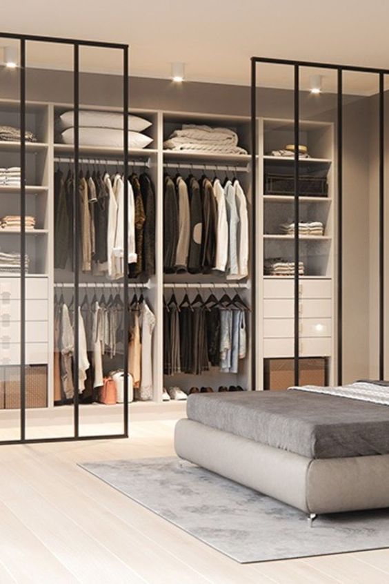 Pour un côté hôtel, vous pouvez choisir d’installer votre dressing sur toute la longueur de votre mur. Vous pouvez alors varier les rangements en intégrant des portants, des étagères, des casiers et des tiroirs. Cela afin de ranger tous vos vêtements et accessoires. Ce dressing tout ouvert peut être séparé visuellement de la chambre par une verrière. Ce qui permet de conserver une vue sur le dressing.