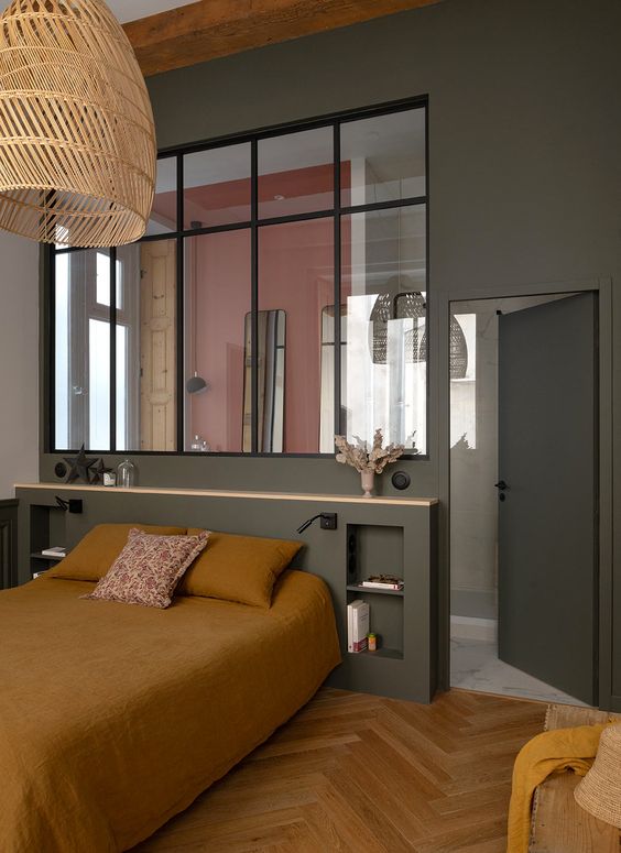 Ce type de plan apporte un petit côté hôtel chic à votre suite parentale. Il est idéal pour les chambres de plus petite taille. Pour réaliser ce type d'aménagement, il convient d’installer le lit au centre de la pièce contre une cloison qui permet de cacher derrière une salle d’eau et un espace dressing. Pour agrandir visuellement l’espace vous pouvez ouvrir la cloison en partie haute avec une verrière. Et pour plus d'intimité, vous pouvez conserver une cloison pleine.